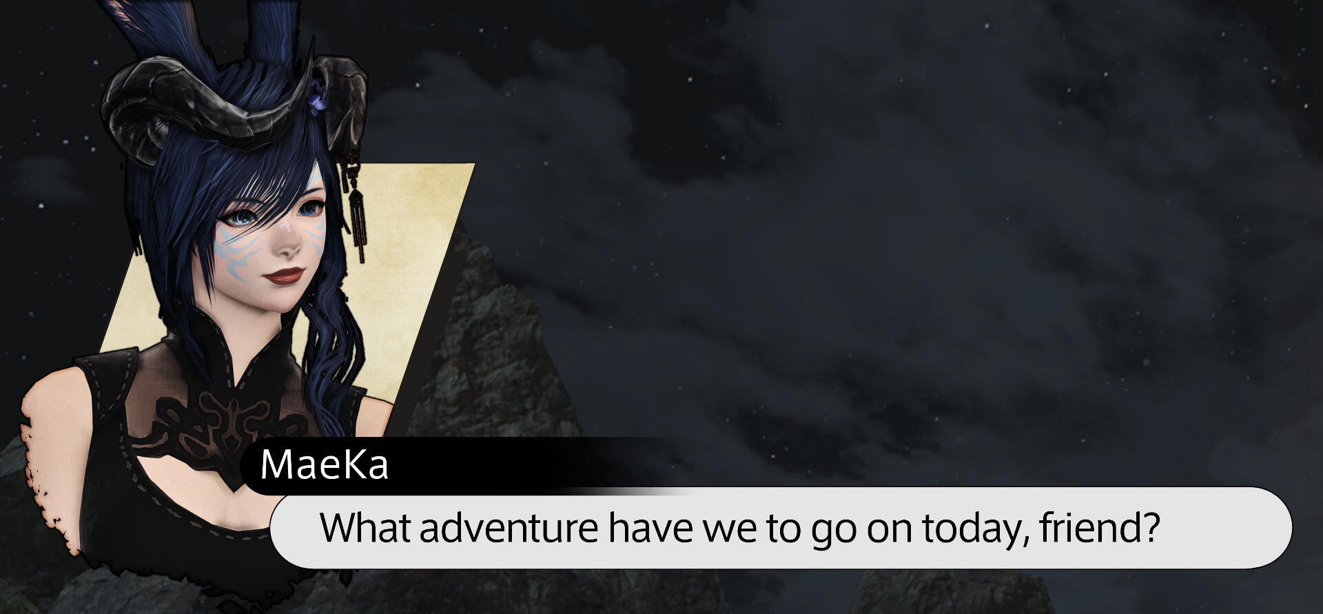 World Building Roleplay - A good way to develop a character is through their relationships with others. Being a non-Warrior of Light with an intricate backstory of her own, MaeKa offers an interesting perspective and relationship with your character that can help both of them grow and evolve!In-Character Dungeon Running - Going through your MSQ? Got an idea for why in the world you're running a low level dungeon this late in the game? MaeKa is here to offer in-sight and chatter, all while fulfilling whatever role you might need-- dps, tank or healer!Sidequests - Need to make some gil, or looking for fun prizes? MaeKa's got plenty of errands she needs running! Check in with her and see if she has any on-going quests that need doing, from collecting materials or various knickknacks, to having a bodyguard while she explores a dungeon! Her rewards vary and are negotiable!Companionship - Need someone to talk to? MaeKa is available for conversation! Whether you'd like to speak to her in character or out, she's quite the chatterbox!
