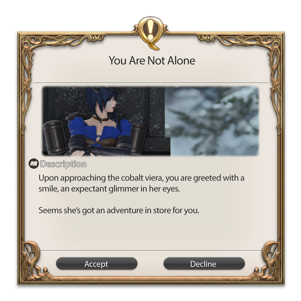 Quests for Disciples of War or MagicEveryone Can Use a Hug - The always excitable viera has a well-meaning but perhaps unwise goal today: to hug as many tonberries as she can! Of course, it wouldn't do any good for a lady to go on such a dangerous mission alone! It's your job to accompany her as she makes her way through the Wanderer's Palace, warding off any potential threats, and trying to convince her NOT to try and hug the very large tonberry with a very lethal knife.Quests for Disciples of Land or HandIt Isn't Too Hard To See - Being a viera, MaeKa is very attuned to nature and aether, and she's heard word of a flower that's naturally attuned to astral aether. She's looking for a gleaner that is willing to accompany her to gather some! Rumor has it this flower only blooms at a specific time, and she would like to be there to see it happen!