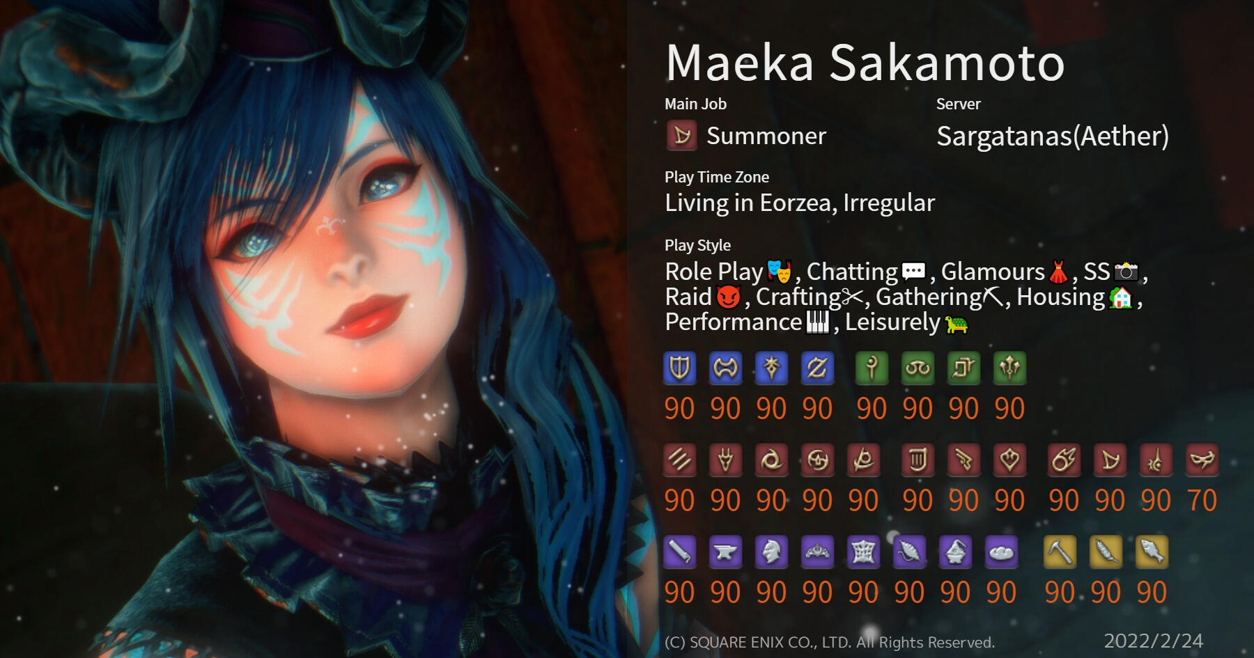 Omnicrafter/Gatherer - Running pentamelded crafter gear, it gets the job done well enough! (Though between you and me, I have some catching up to do on those DoH job quests, ehehe...) I'm always looking for things to do in my off-time! Need something crafted, or need someone to gather mats for you in bulk? Hit me up! Specialist in CUL, WVR and GSM!Photographer - Spare time GPoser, will happily take pictures of your handsome, beautiful, and adorable Warriors of Lights! ( See Photo Gallery )Barding - Nothing professional, often times just playing whatever music I like, but available if you need someone to bard in your venue! I'm open to suggestions for my repertoire! ( See Barding Carrd )Raiding - Currently in a static, progging P8S! Also usually available to farm old content for glam, mats, mounts, etc.!Discord - I am more often than not available, even when I'm not in-game! If you need to reach me, I can be found either in Azure Oasis's venue discord, or at MaeKa#2457 ! I'm always happy to make new friends, so feel free to send a message! Please say who you are, of course.