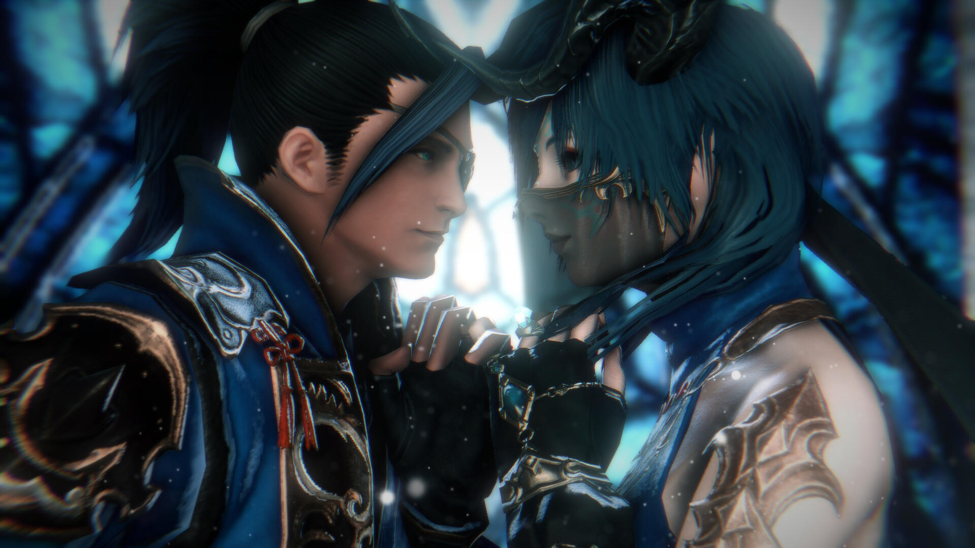 On a shard far apart from Eorzea was a world where monsters roamed free, and the ecosystem teetered on a very careful balance. Hunters of all sorts rose to the occasion to help preserve this balance, training their lives to keep their homes safe. It hadn't been long since a new continent had been discovered, and fleets from all over had been sent to slowly begin to inhabit this new world in hopes of learning more about it. Fleets were sent from the mainland, filled with researchers, hunters, builders, all sorts. This story begins with the fifth fleet, filled with smiling fledgling hunters and experienced warriors who sought to hone their skills.On a fateful day, a woman with hair as deep blue as the ocean itself washed upon its shores, with no home to speak of. She was small, clearly not like the hunters of this world, but that didn't stop her from thriving. She slowly trained amongst these hunters, until she was recognized by the fifth fleet on this new continent. Soon, she was a core part of the fleet itself, a mother figure that wanted nothing but the best for this newfound family of hers. While gentle and kind to those she took under her wing, on the field she was a vicious warrior, a flash of blue that could take down monsters far larger than herself. She was a mistress of the glaive, a cobalt maiden that held the respect of those in her fleet.In a village known as Yukumo, a young man stood a cut above the rest as their beloved samurai. While his origins remained unknown, it was clear he was trained in the art of war, and a fire within that burned with the desire to protect. After an unforunate incident, he had laid his sword down, but fate wasn't done with him. He was one of the elite that was called upon to head to the new world, to help navigate this foreign, untouched territory. While his own tragedies had kept him from the field at first, slowly he grew back into his role as a hunter and once again rose through the ranks. While this new world brought with it new challenges, the Azure Samurai eased back into his role as easily as breathing. He was tenacious, he was unyielding, and any monster that crossed his path had its days numbered.Cobalt and Azure met on a fateful day, a rather unassuming meeting. In the icy terrain of the new base the fifth fleet had set-up, the samurai had been returning home after a hunt as he often did. The maiden, having just been given permission to move to this new base, made it a point to get to know every hunter, researcher, handler, and all else in between. She greeted him with a gentle smile, and he greeted her in return with a few words. They marveled at the fact that their paths hadn't crossed until then-- better late than never, at least.On a particularly cold night, as the rest of the fleet was alive with festivities, the maiden sat out in the snow, relishing in the silence. The samurai, not one for festivities, happened to catch a glimpse of her on his way out, and took a seat by her side. That was the first night they spent talking to one another in depth, each sharing small tidbits about their pasts and inevitably growing more fascinated with the other.Soon, the two began going on expeditions together, watching each other's backs as they wandered through the new world. They were an unstoppable force together, their fighting styles almost always in sync. She found herself seeking out his company when not working at the canteen, and he found he was working less and less solo, and more with her at his side.The cobalt woman, otherworldly as she was, carried with her a condition that needed constant monitoring, Her body was not meant for this world, and without the proper energy to sustain herself, it wasn't long before she fell victim to it. As she pushed herself to her limit, she fell to the ground like a ragdoll, with the samurai being the first to find her. He carried her to his room, intent on looking after her-- after all, he couldn't let a dear friend be left in such a state alone, could he? She was grateful, albeit stubborn about accepting his help at first, feeling she was deserving of punishment for not looking after herself properly. He tried to assure her that it was okay to rely on others, and she was no burden, especially not to him.Her recovery was slow, but he was with her every step of the way. Before long she was back on her feet, with a gratefulness towards the samurai that she could never properly voice. He told her to think not of it, for he was the sort who would lay down his life for the sake of those he cared for.Business began again as usual for them, hunting day in and day out as more of this new world was discovered. Come the discovery of a strange area known as the Gathering Lands, they were two of the first to map it out in its entirety, spending weeks at a time out in its depths. He showed her his little tips and tricks for navigating around, and in return she kept watch over him on their expeditions, making sure the two were fed and rested on the longer forays away.